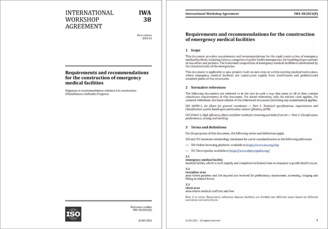 2021年12月20日,國際標準化組織(ISO)官方網站正式發布了中國中元牽頭提出的國際研討會協議IWA 38《應急醫療設施建設導則》(以下簡稱“《導則》”)。